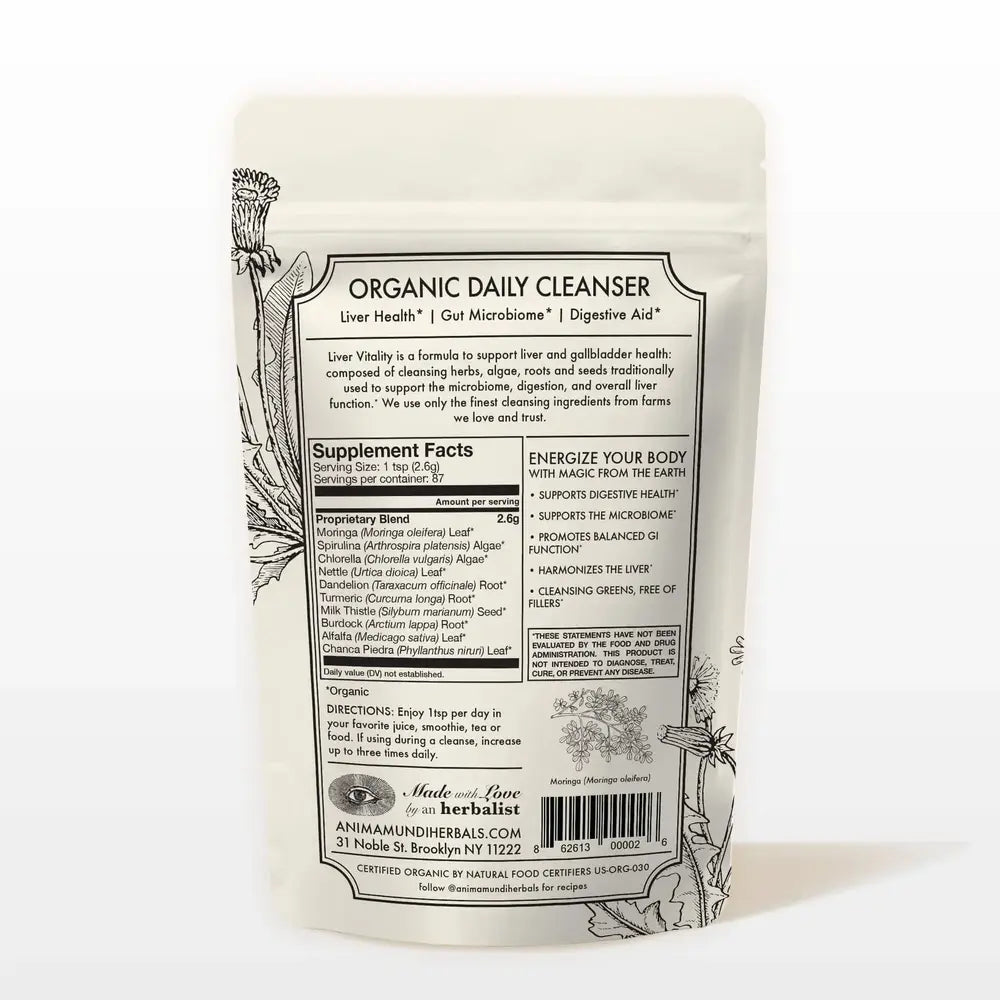 Liver Vitality is a therapeutic, cleansing superfood with the power to support the liver, harmonize digestion and nourish the gastrointestinal tract. This cleansing powder is formulated with traditional herbs, roots, algae and seeds known to greatly assist the microbiome: using key herbal prebiotics, such as Dandelion Root, Burdock Root, Nettle, Milk Thistle and Alfalfa, alongside nutrient rich algae such as Chlorella and Spirulina. Liver Vitality also contains Moringa and Chanca Piedra, two of the most nutrient dense herbs from the jungle.*