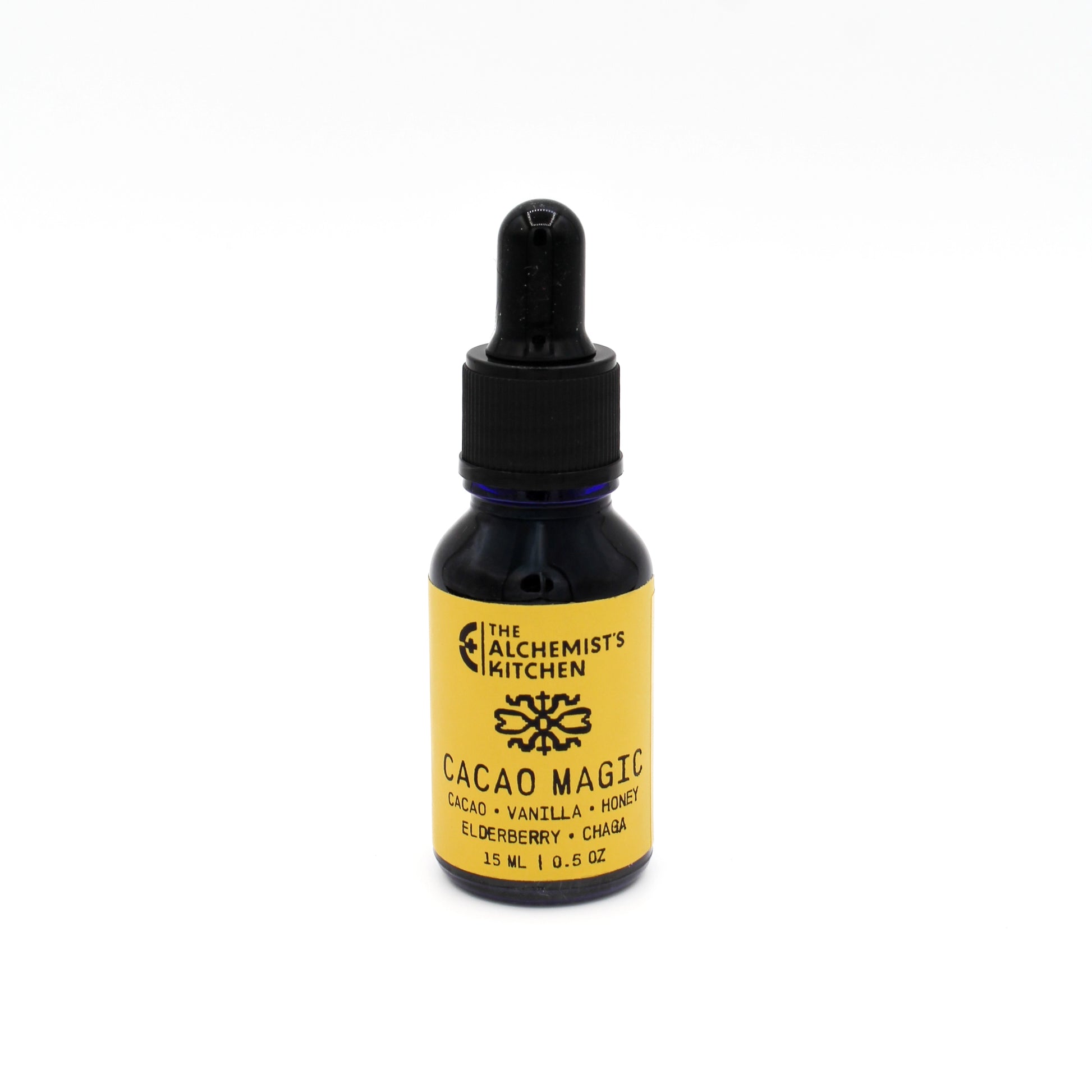Our Cacao Magic is formulated with raw cacao nips, wild harvested elderberry, chaga mushroom, vanilla bean and raw local honey to create a divinely flavored and scented extract.